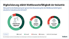 Der wirtschaftliche Druck trifft die Industrie in einer Phase, in der sich der internationale Wettbewerb weiter verschärft. Im internationalen Vergleich liegt Deutschland nach Selbsteinschätzung der Unternehmen bei Industrie 4.0 nur auf Platz drei. Ein Zehntel (10 Prozent) der Industrieunternehmen sieht Deutschland international beim Thema Industrie 4.0 vorne. Als führende Nation bei Industrie 4.0 wird derzeit am häufigsten China genannt (34 Prozent), und auch die USA werden von 21 Prozent in diesem Bereich führend wahrgenommen.