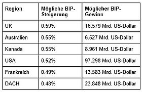 In den untersuchten Regionen wäre ein durchschnittlicher Anstieg des Bruttoinlandsprodukts um 0,52 Prozent möglich – was einem Gewinn von über 142 Milliarden Euro (167 Milliarden US-Dollar) entspricht. Speziell für die DACH-Region wäre eine durchschnittliche Steigerung des Bruttoinlandsprodukts um 0,48 Prozent und damit über 20 Milliarden Euro (23 Milliarden US-Dollar) möglich.