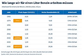 Ein Liter Super kostet derzeit 2,08 Euro, der durchschnittliche Nettolohn liegt bei 25,56 Euro pro Stunde. Beschäftigte arbeiten also knapp fünf Minuten für einen Liter – weniger als in allen großen Krisen der vergangenen Jahrzehnte. Während der Ölkrise 1974 waren es 6,3 Minuten, in den Jahren 2011 und 2012, als der Ölpreis infolge des Arabischen Frühlings auf über 125 Dollar stieg, knapp sechs Minuten. Selbst der Ukrainekrieg trieb den Wert im Jahr 2022 nur auf 5,2 Minuten.